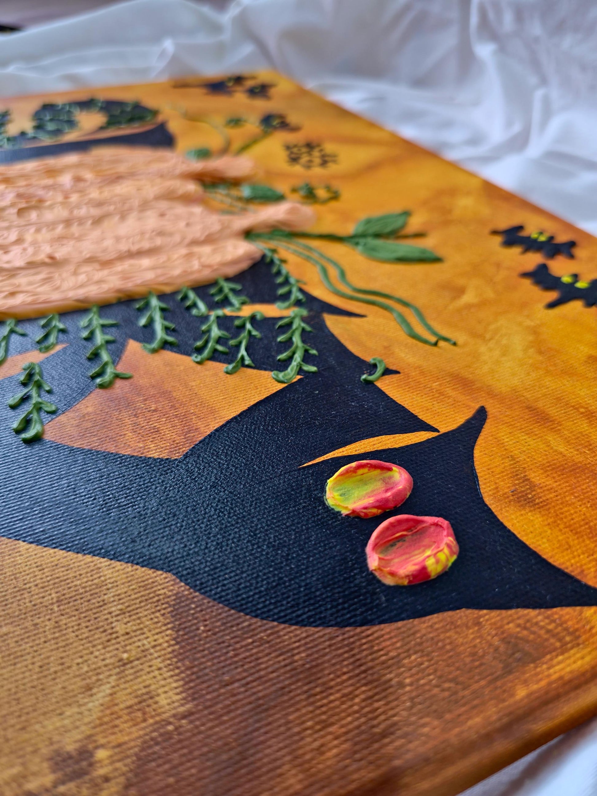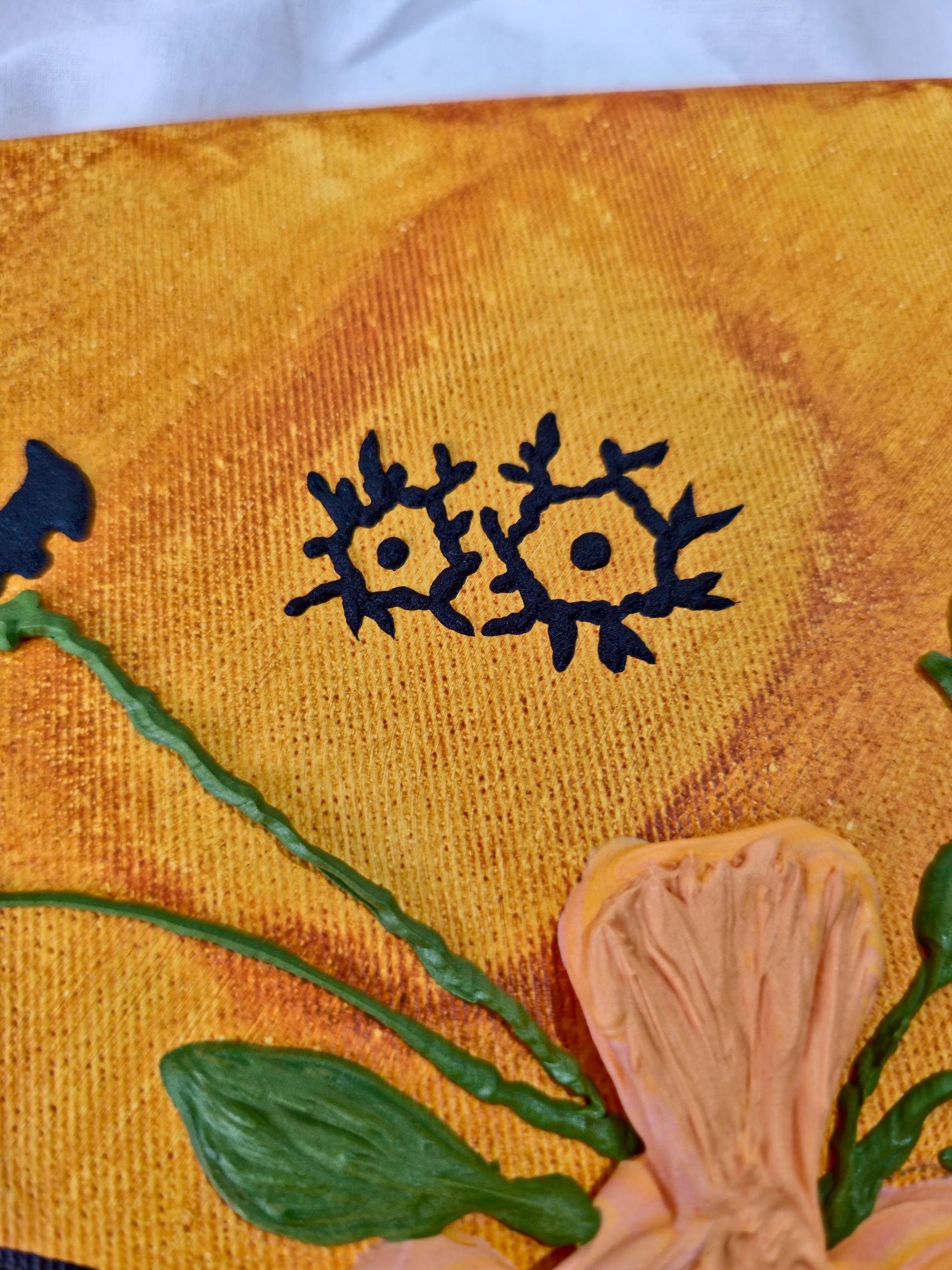 This canvas was inspired by Halloween and the spooky season. I went with my instincts, adding whatever felt right—bats, ghosts, flowers, eyes... I also wanted to make it a bit unique, so I used only acrylic colors for the background, keeping to traditional shades. The rest was created with texture paste to add a 3D, dimensional effect. It’s a painting that can definitely light up any home with a spooky yet positive vibe.