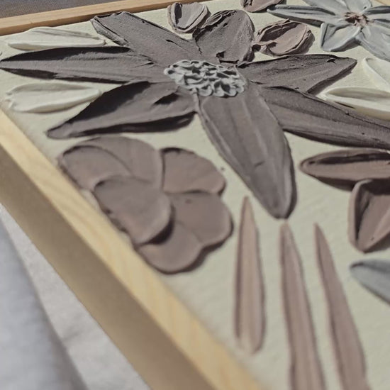 This is an original acrylic painting featuring 3D textured flowers in soft, neutral tones—shades of brown, grey, and white—set against a simple background that lets the details stand out. The flowers are created using structure paste, giving them a beautiful raised texture that adds depth and a tactile quality.