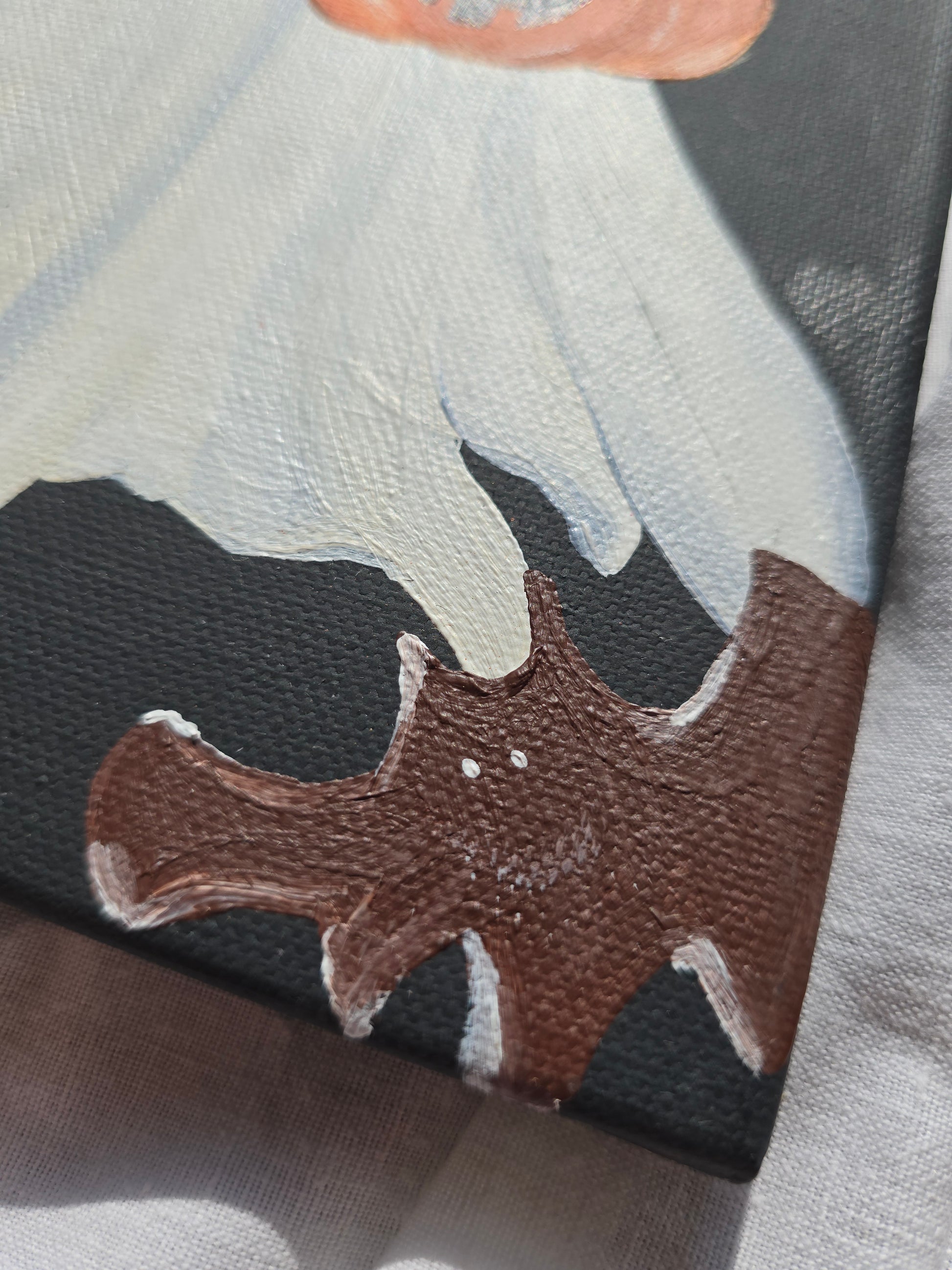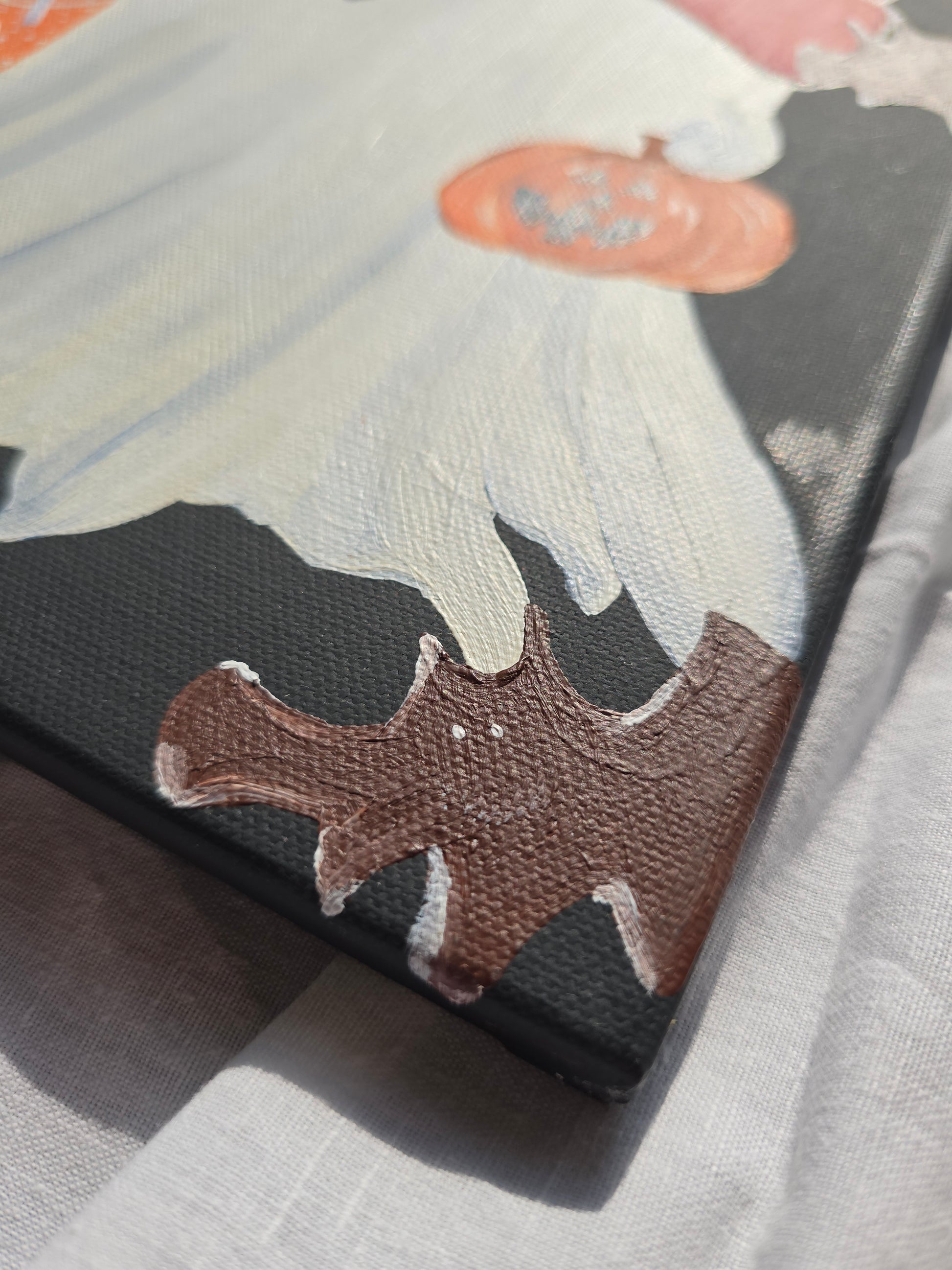 This is an acrylic painting on a black canvas featuring a ghost with a twist—it’s both cute and a little creepy! The larger ghost is holding a tiny pumpkin, making it a charming and fun duo.