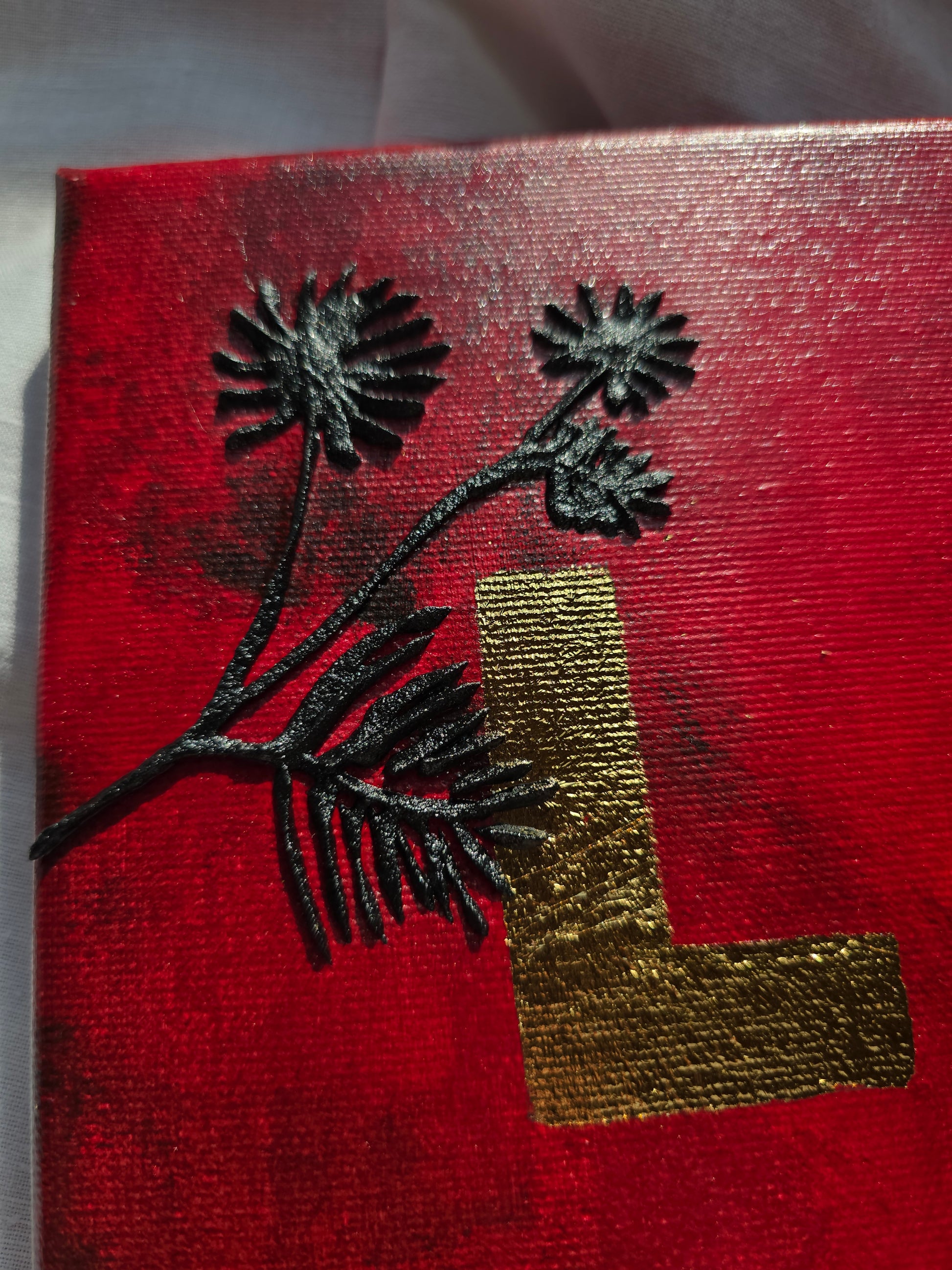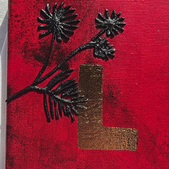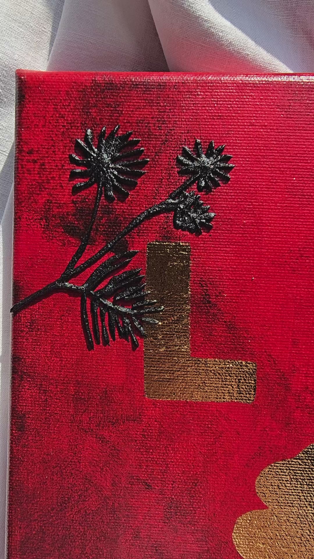 This is an original acrylic painting on a 30 x 40 cm canvas, featuring a bold red background with a touch of black for added depth. Across the canvas, the word LOVE is written in large letters, created with real gold leaf—giving it a shiny, eye-catching finish that stands out beautifully.
