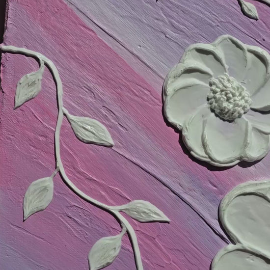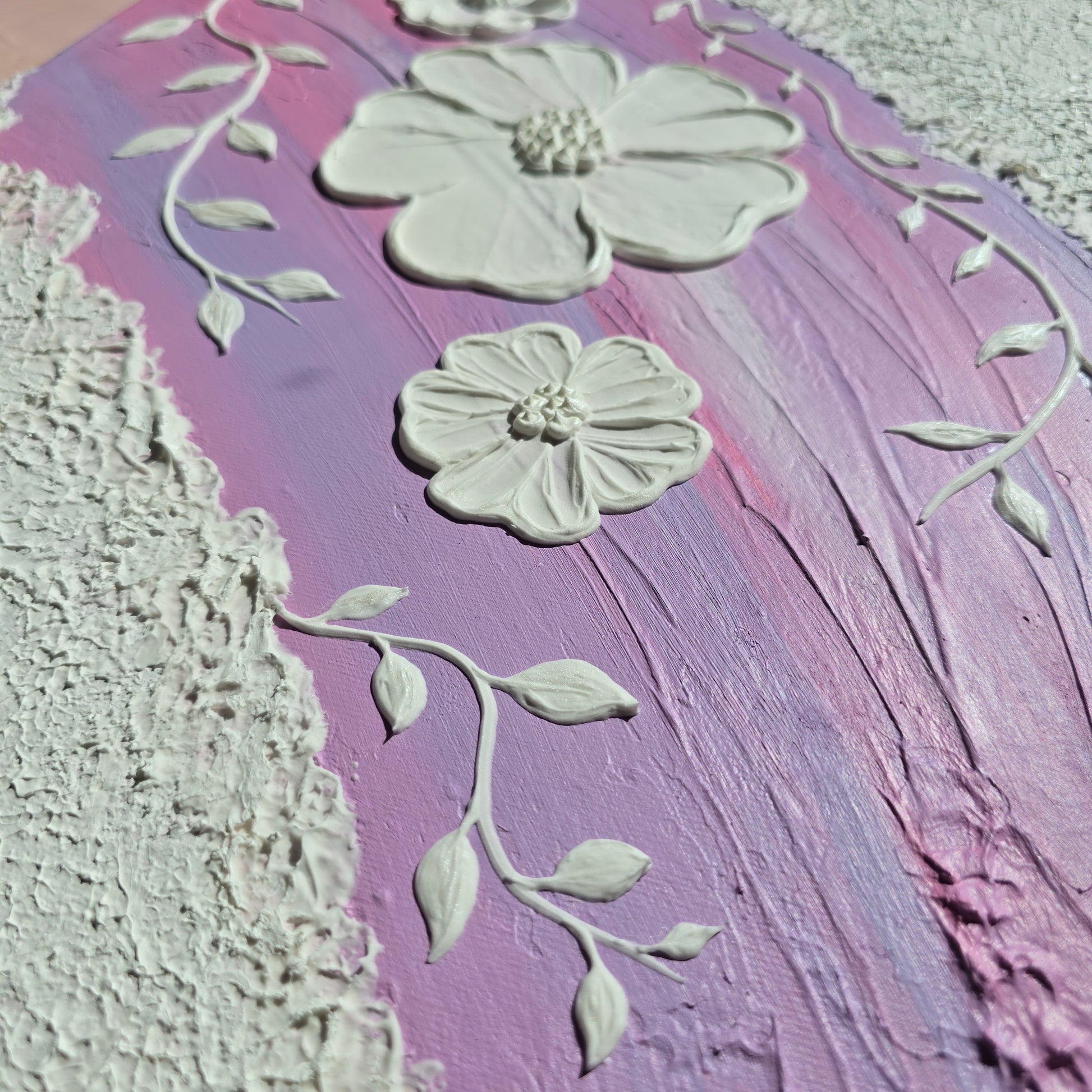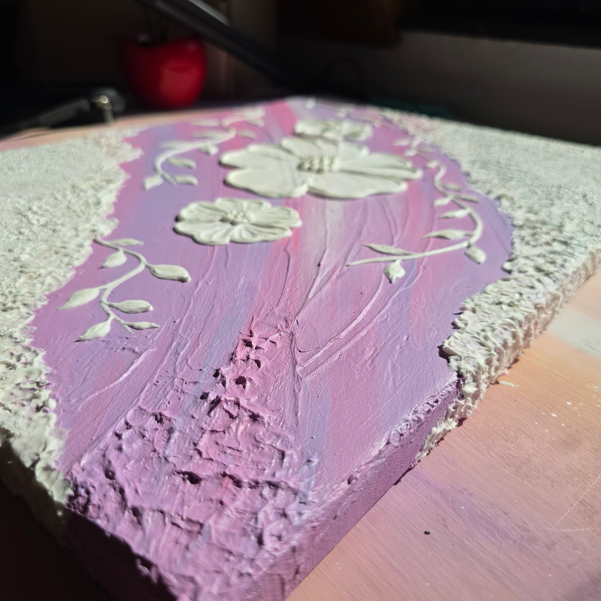 I created this painting by renovating an old canvas that never felt quite finished. It started out with pastel yellows, blues, and oranges, but over the course of a year it transformed into something more delicate and vibrant. The center of the piece is filled with soft pink and purple brushstrokes, blooming with 3D flowers and leaves sculpted from texture paste.