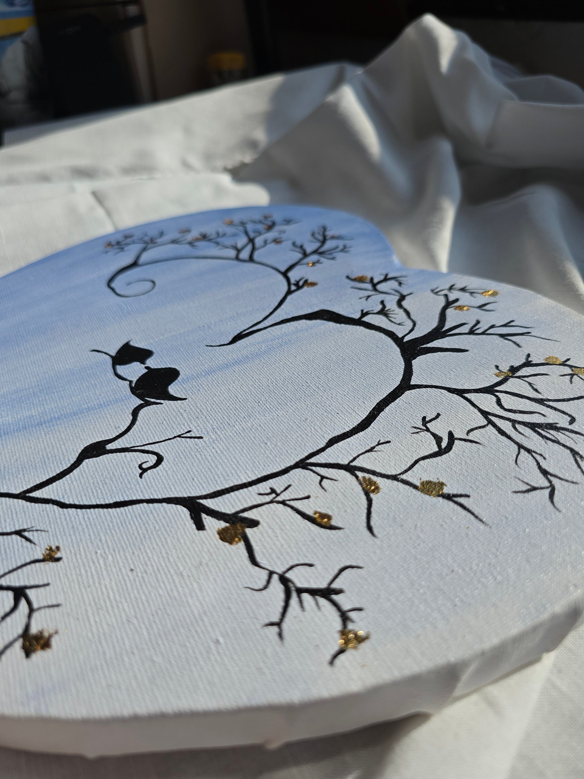 Heart Canvas Tree Painting with Birds: Romantic Acrylic Art