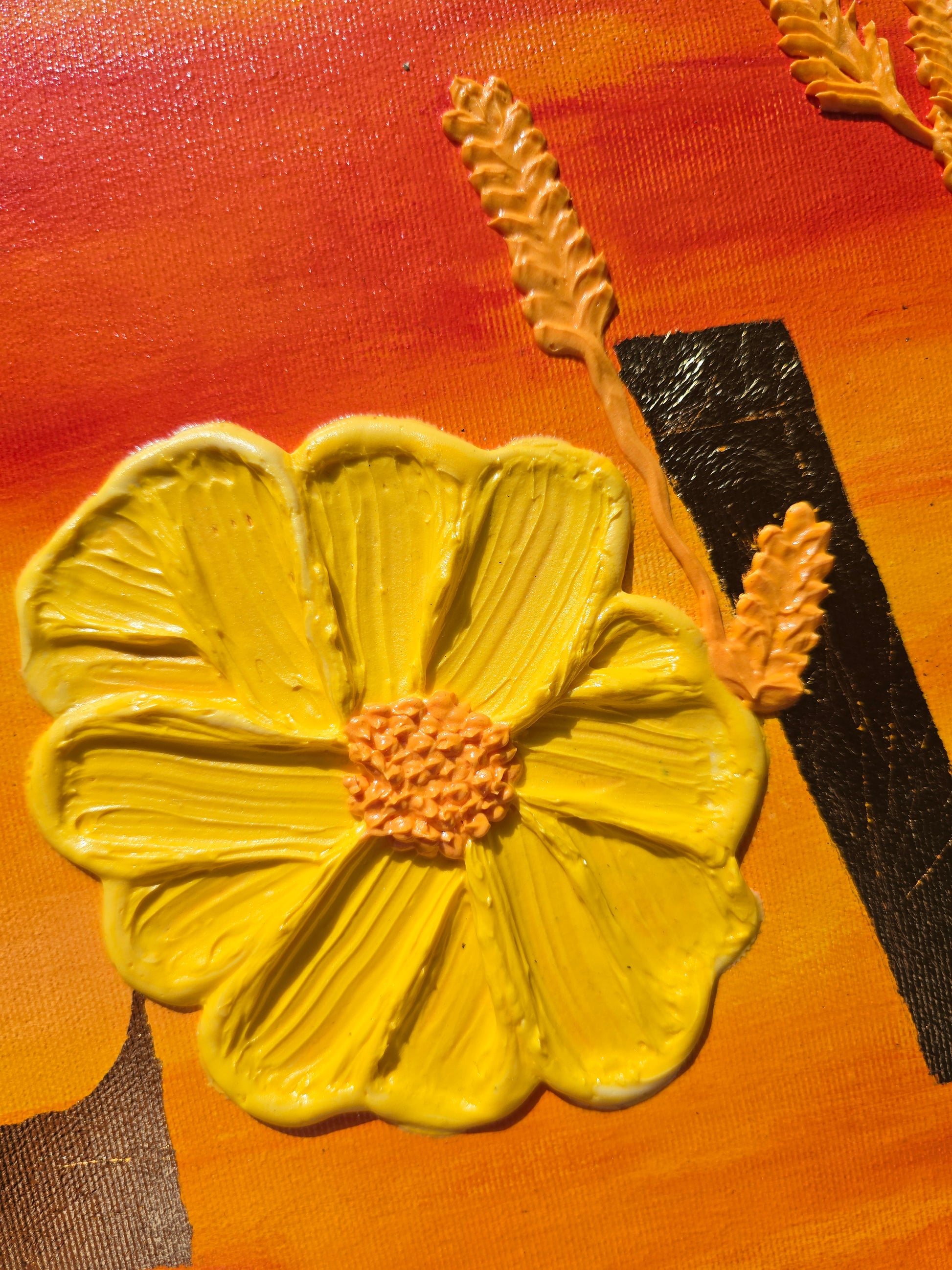 For this piece, I incorporated my love for sunsets and chose the word LOVE—something we all need. I used imitation of gold leaf to make the word stand out, along with 3D yellow flowers made with texture paste to give the canvas added depth. The small birds symbolize the freedom that comes with love, much like the feeling of a beautiful sunset.