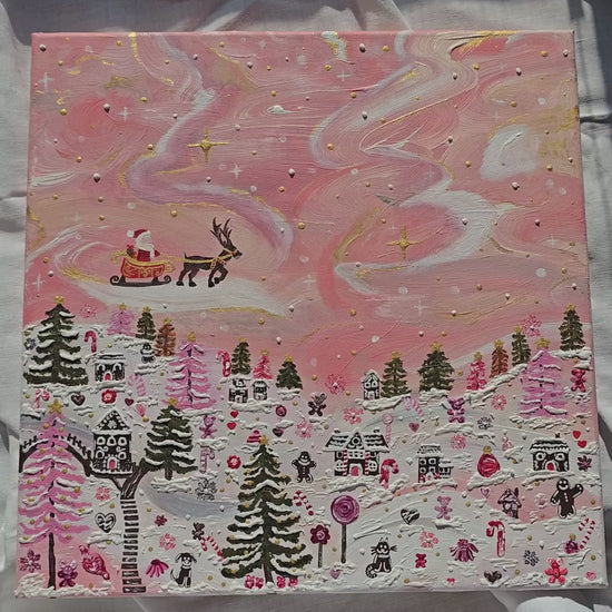 This is an original acrylic Christmas painting full of cozy winter vibes and magical pink skies. The scene features Santa Claus with his reindeer traveling through a snowy countryside, surrounded by a little village of gingerbread-style houses.