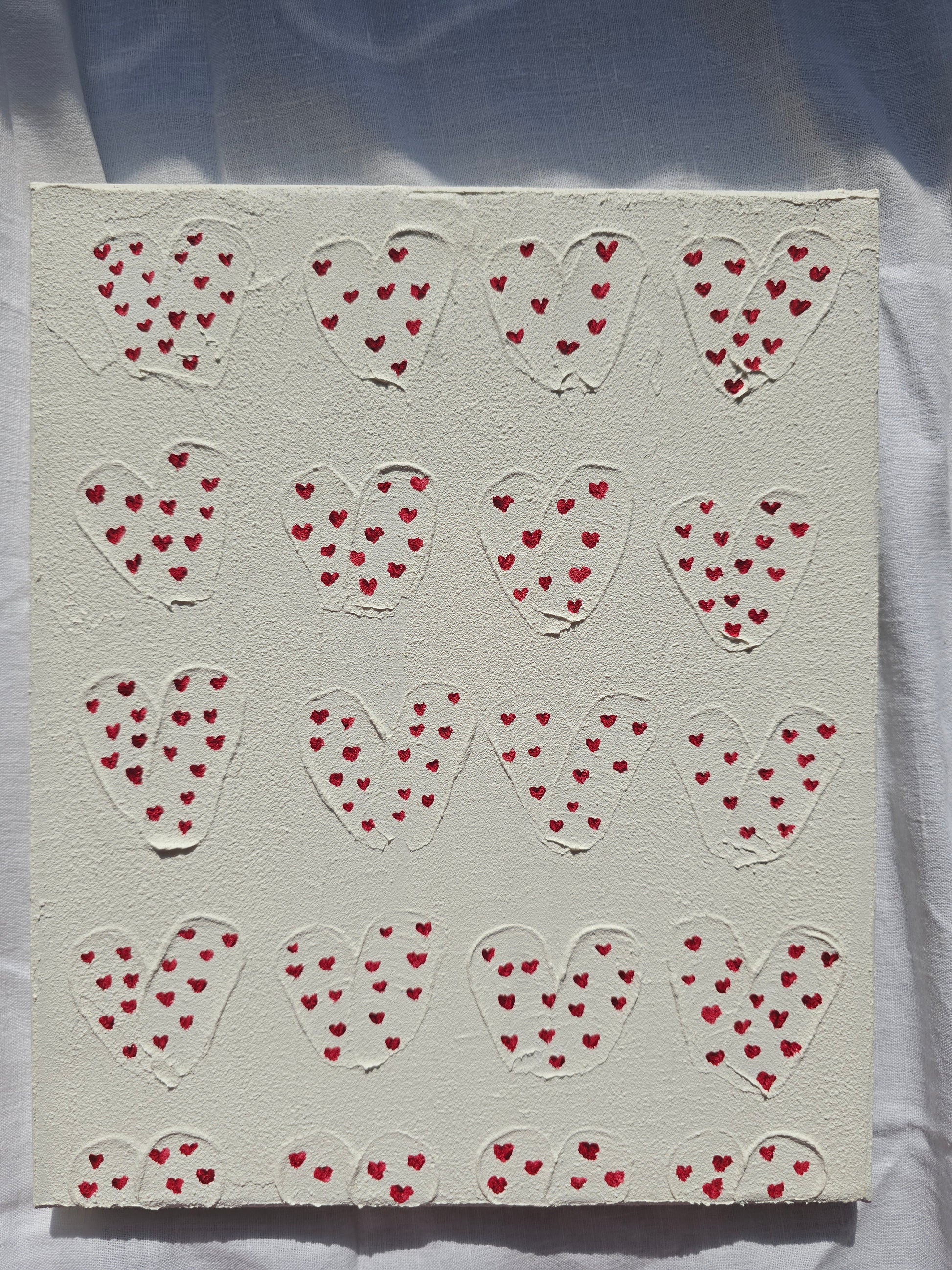 This is a minimalist, original textured artwork created on a 25 x 30 cm canvas. The background has a grainy, structured texture, giving it a natural, tactile feel. Engraved into the surface are small heart shapes, each filled with tiny red painted hearts, adding a subtle yet meaningful detail.