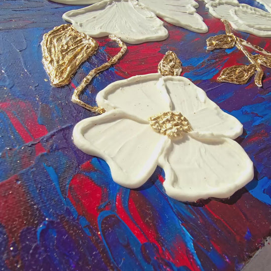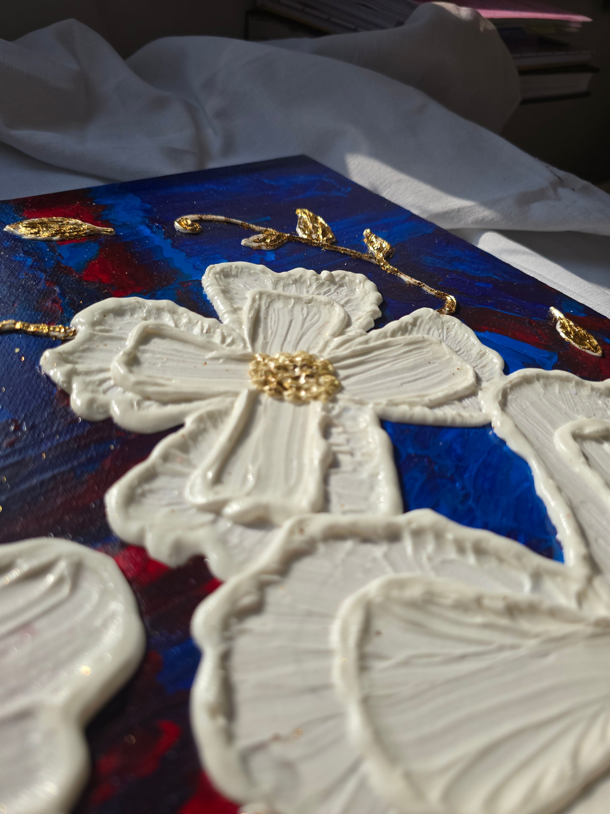 Textured White Flower Painting: Gold Leaf Accent, Blue Red Art (40x50cm)